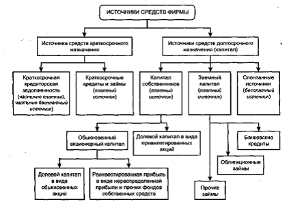 Фирма получает необходимые ей финансовые ресурсы из разных источников. Эти источники могут быть рассмотрены с разных позиций, а потому подразделяются на долго- и краткосрочные, внутренние и внешние, собственные и привлеченные, платные и бесплатные. Некоторые из упомянутых классификаций очевидны, другие требуют пояснения.